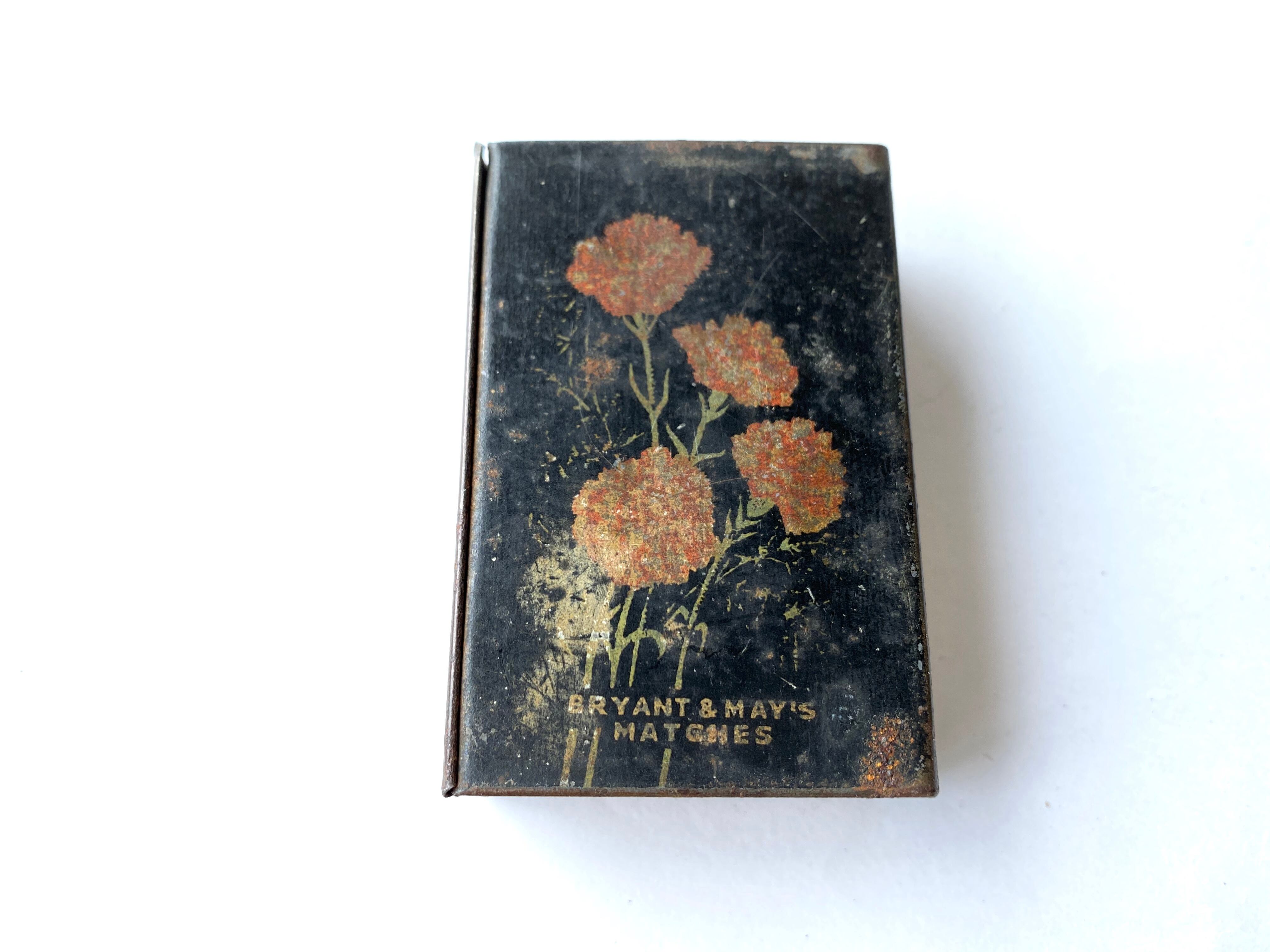 イギリスの古いブリキのマッチケース シックな雰囲気のお花がアンティークらしい表情です ピルケースやジュエリーボックスにも size: W5.8 D3.8 H2 (cm) ※オリジナルのマッチケース付きですが、マッチストライカーなど経年劣化で使用できません。実用の際には、交換いただくようお願いいたします。