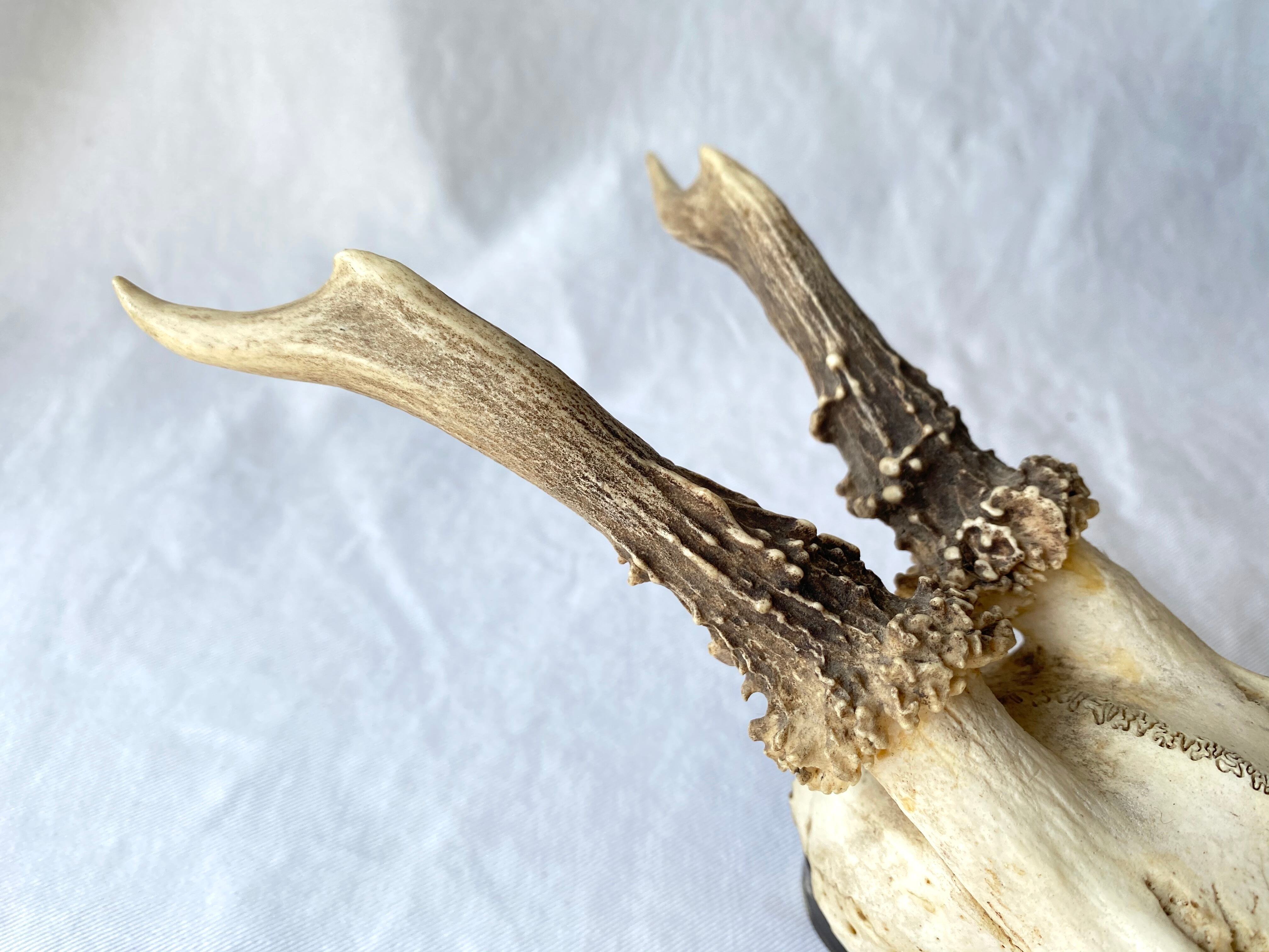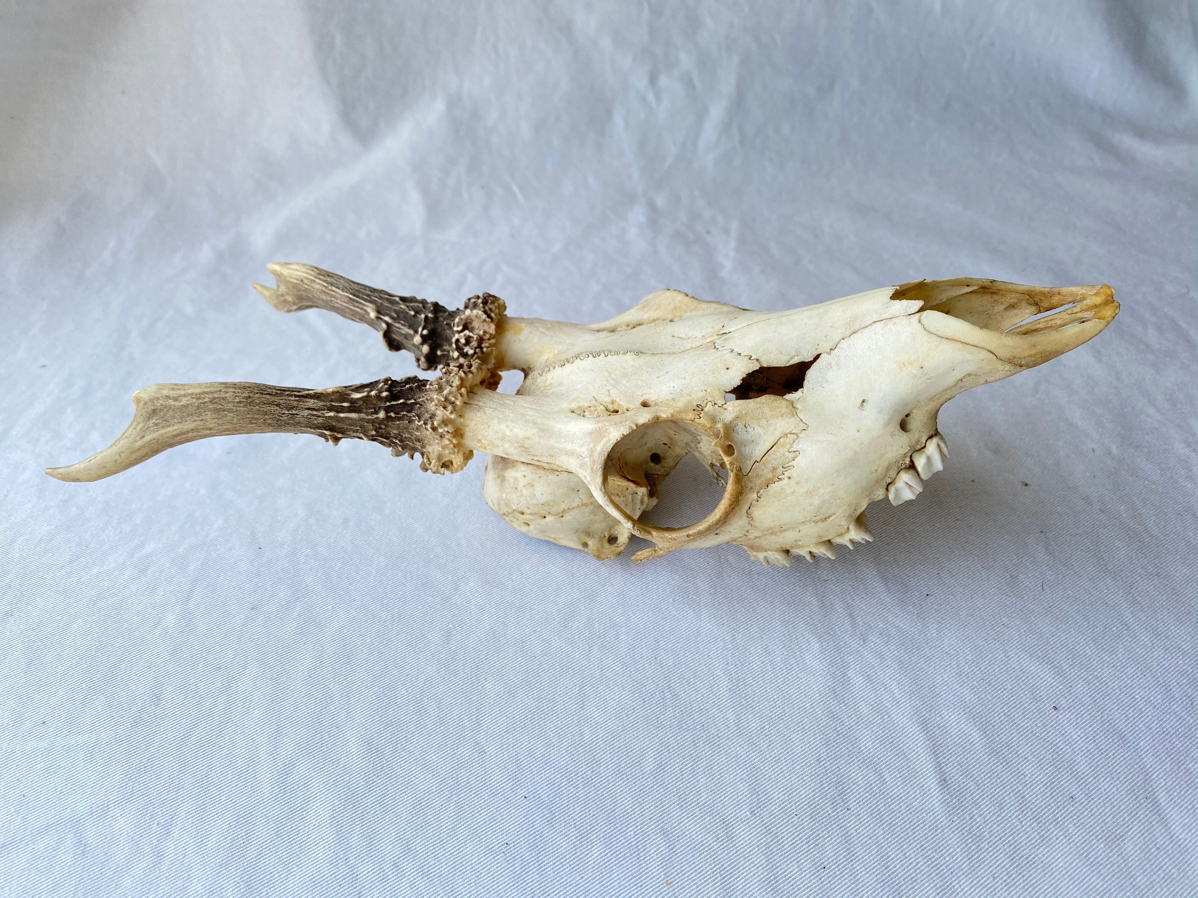 イギリスで仕入れた古い鹿の頭蓋骨 独特の存在感があり、ラスティックな雰囲気を演出してくれます 壁面のデコレーションにもおすすめです size: W 9.5 D 28 H 9 (cm) ※歯に一部欠けがあります 直置きですと4、5枚目のように後ろに倒れるため、壁から吊り下げていただくか支えが必要です