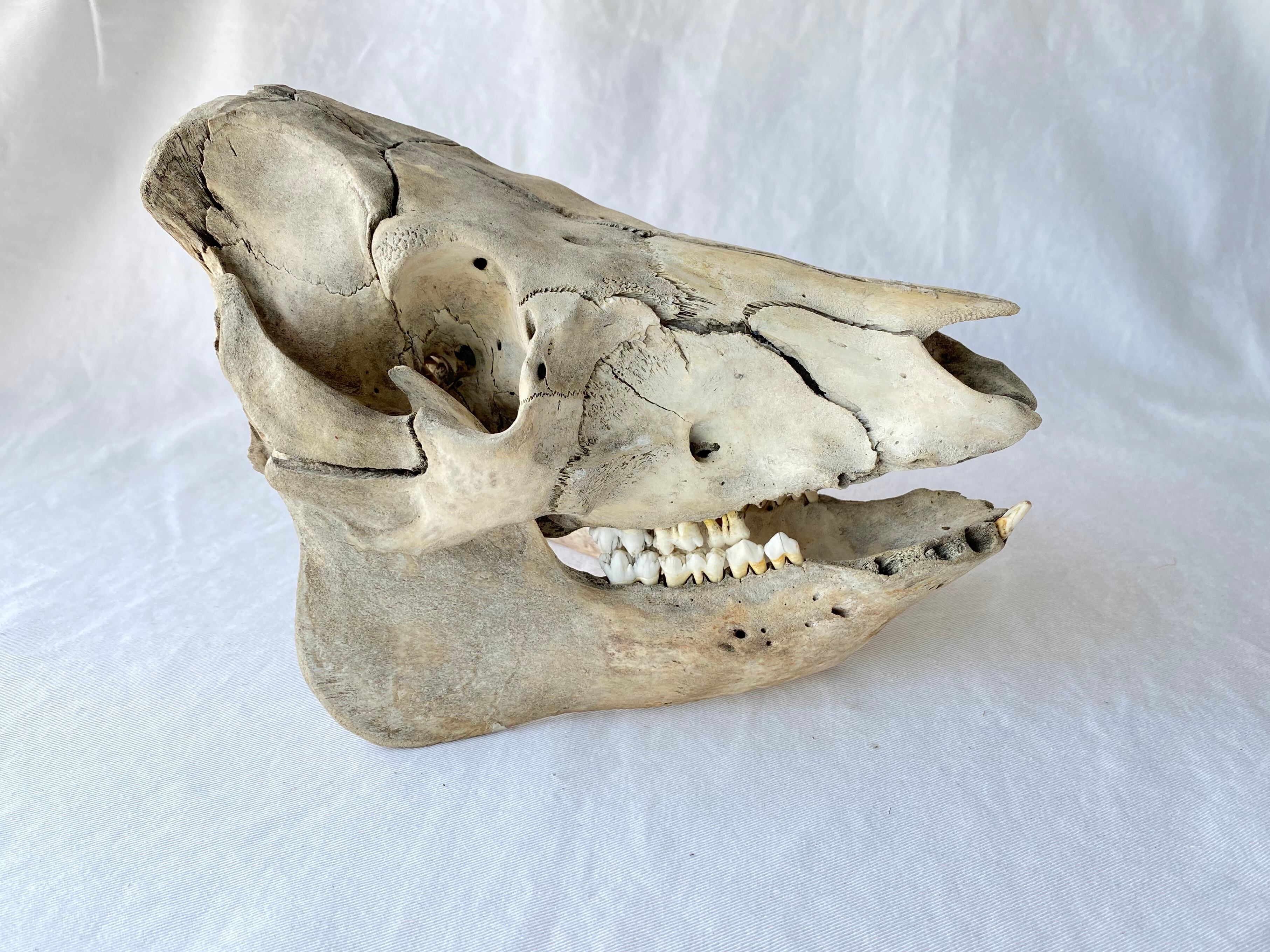 フランスで仕入れた古い猪の頭蓋骨 独特の存在感があり、ラスティックな雰囲気を演出してくれます シェルフやテーブルのディスプレイにおすすめです size: W 15 D 22 H 17 (cm) ※歯に一部欠けがあります 骨に一部修復の跡があります