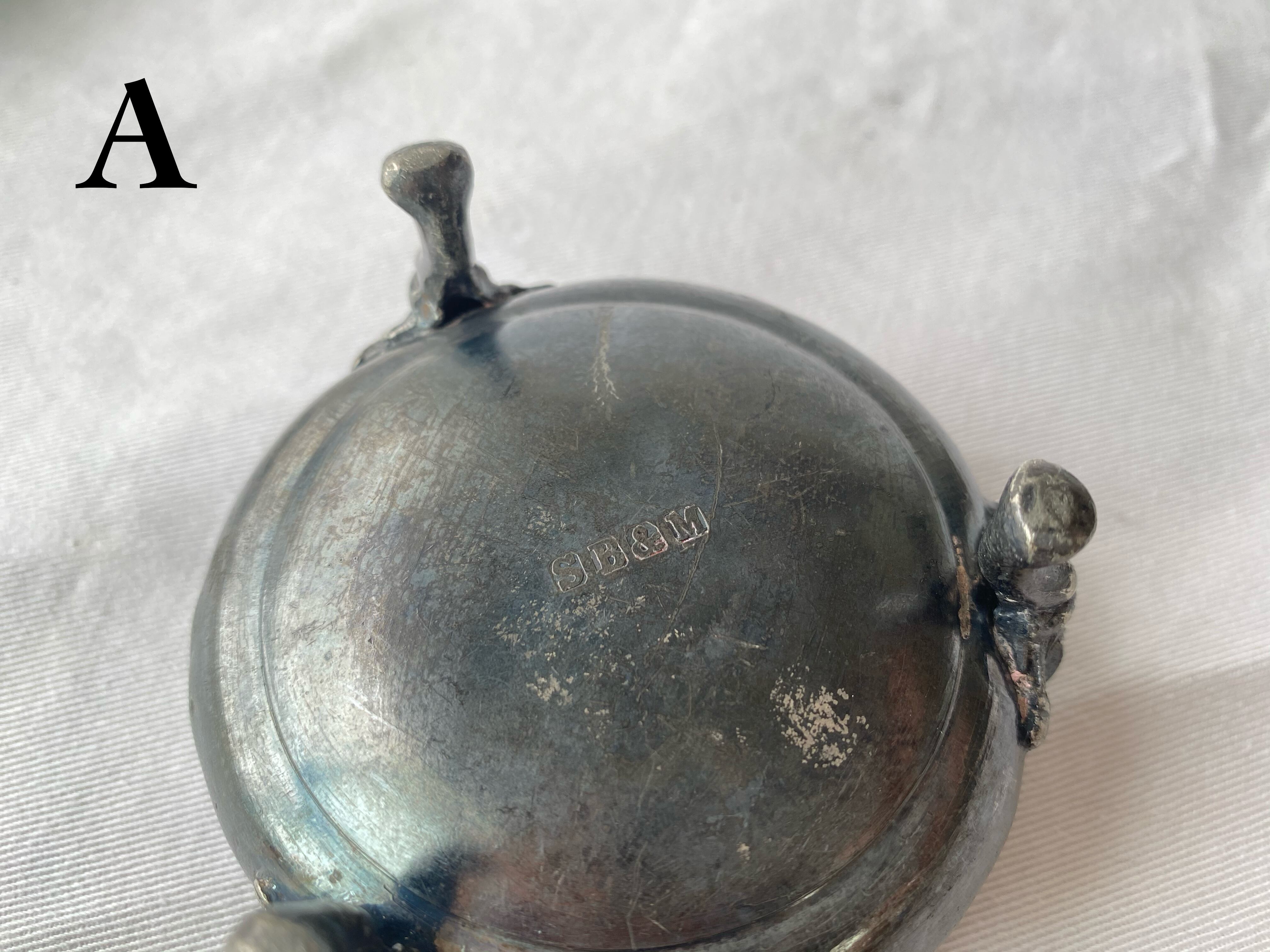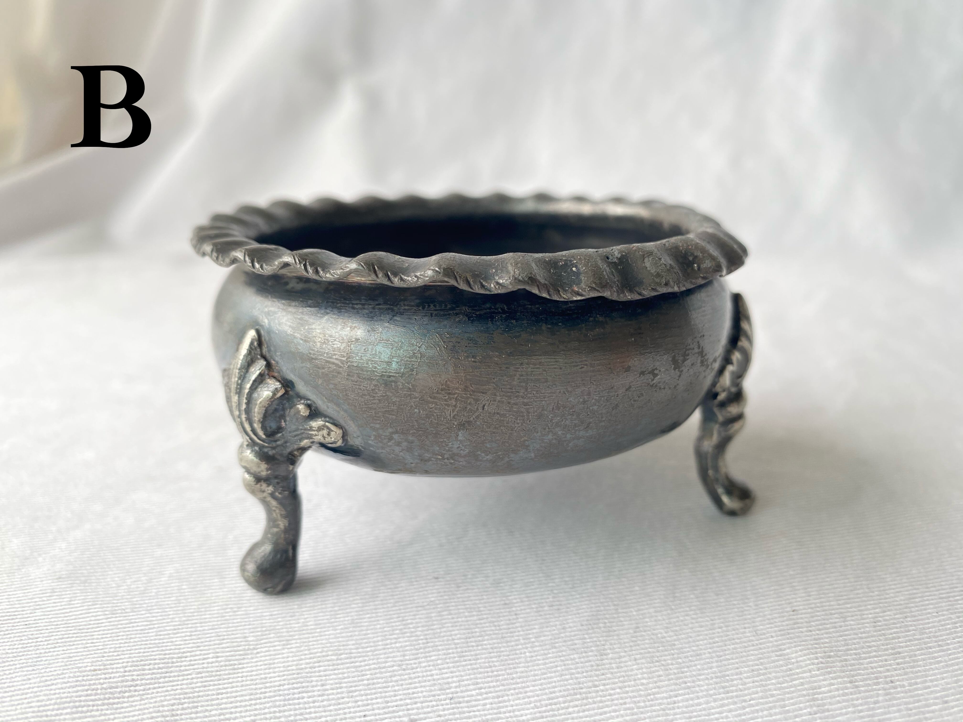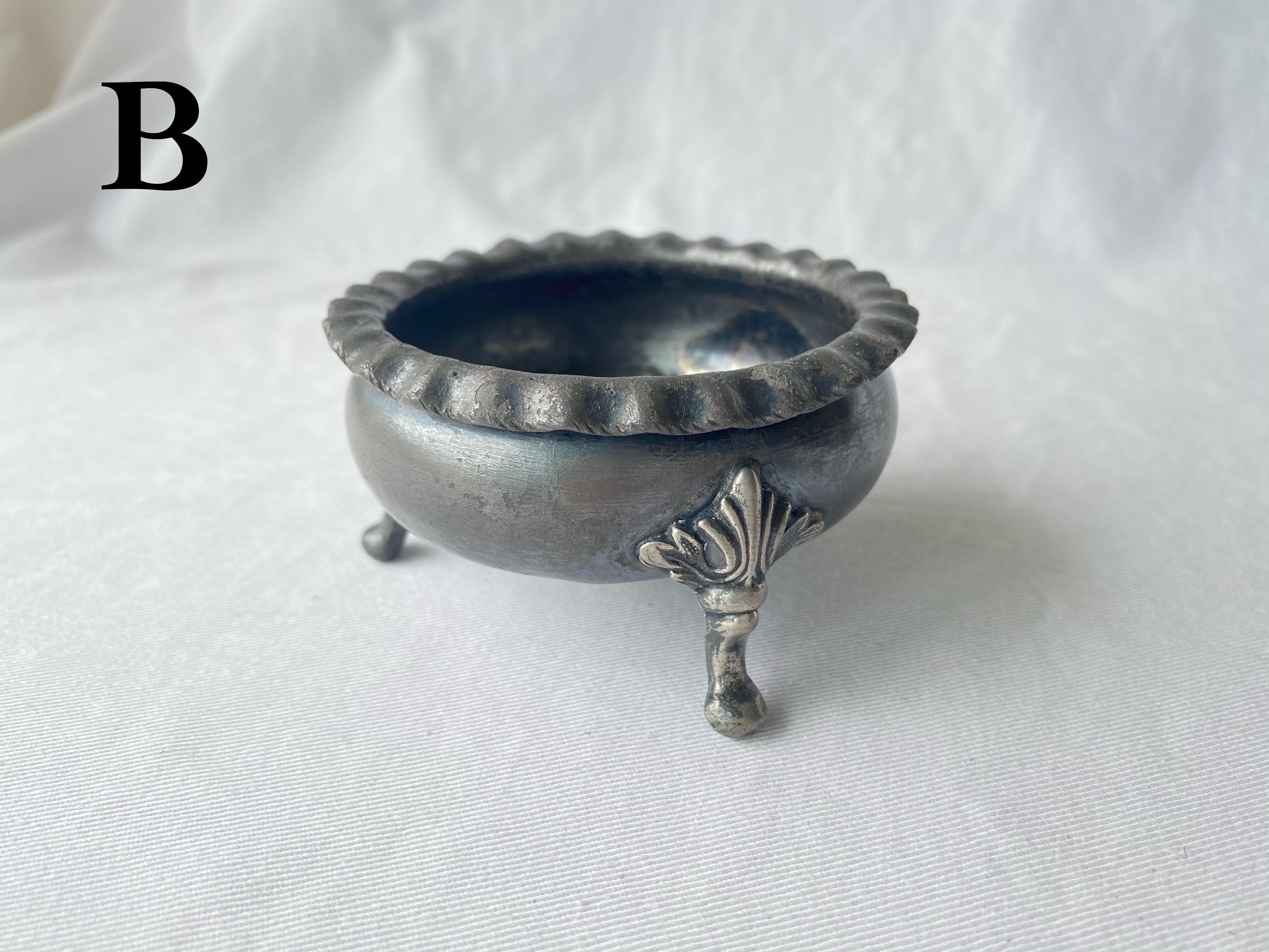 イギリス バーミンガムのSturges,Bladon&Middleton社のピューター(錫の合金)製のトレイ 猫脚にレースの縁取りがかわいらしいデザインです 小物入れや飴などのお菓子入れにもおすすめです size: θ8 H4.5 (cm) ※ABそれぞれの傷凹みなどは写真でご確認ください