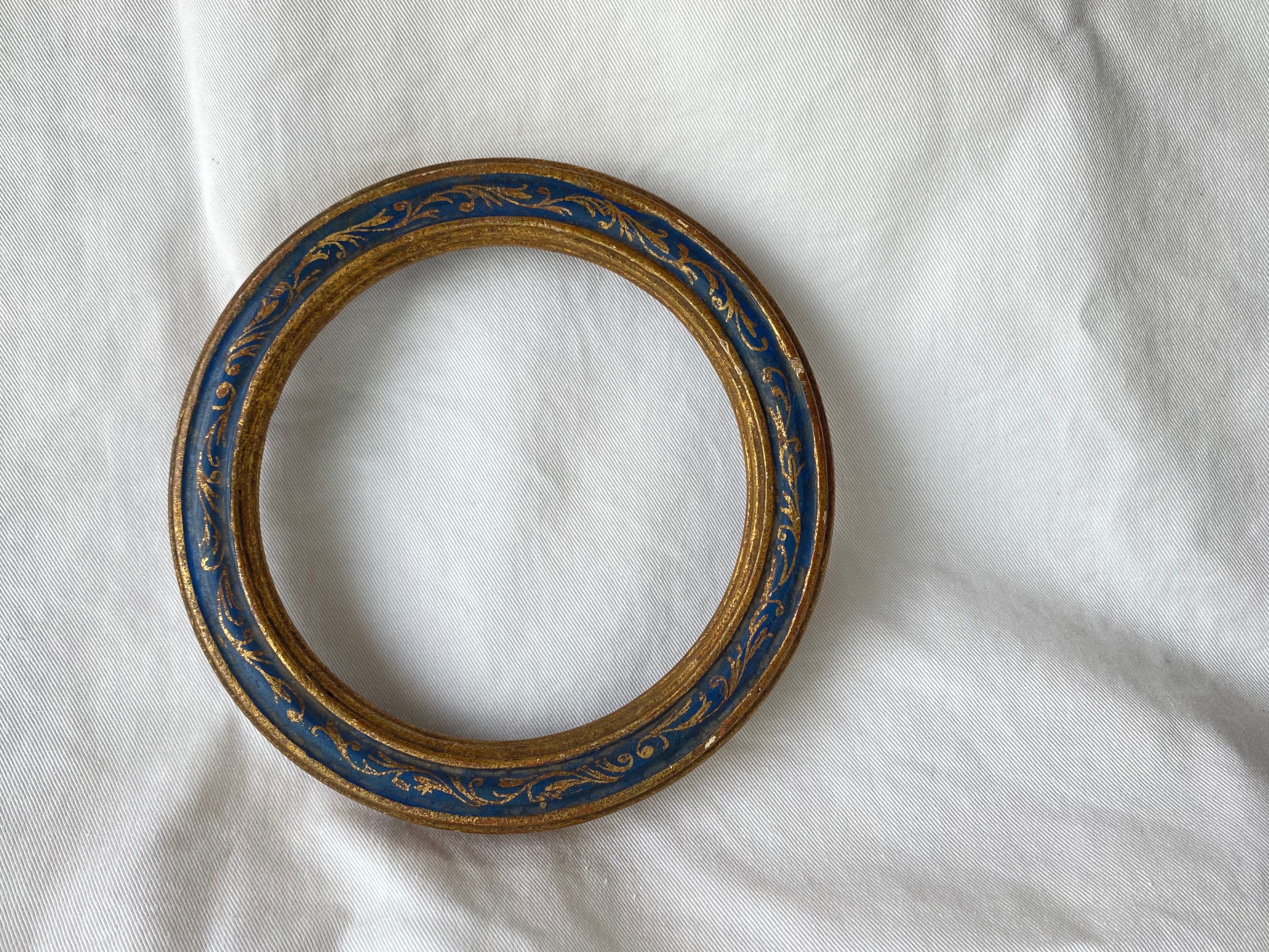 フランスで購入したの古い丸いフレーム 繊細なタッチで描かれたブルーとゴールドの装飾が素敵です 吊ることができますので壁掛けでも、様々なディスプレイをお楽しみいただけます